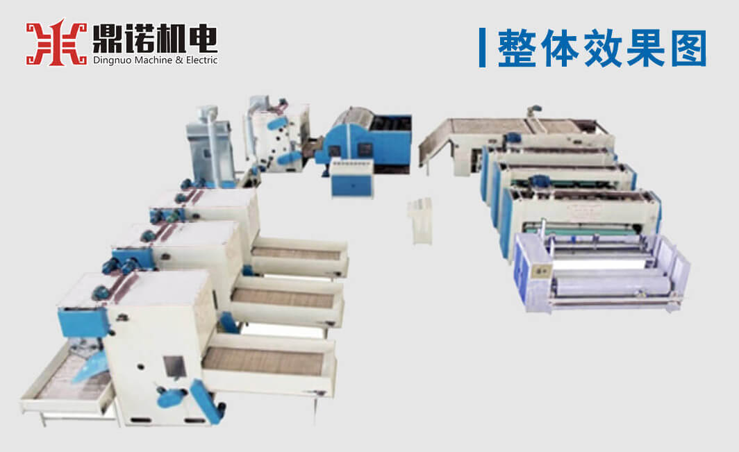 針刺棉生產(chǎn)線將纖維經(jīng)過(guò)開(kāi)松、梳理、鋪成纖維網(wǎng),然后將纖維網(wǎng)通過(guò)刺針加固成布,將纖維網(wǎng)反復(fù)穿刺,鉤帶纖維加固,形成針刺棉,廣泛應(yīng)用于服裝行業(yè)、汽車行業(yè)、空氣過(guò)濾、墻布、床墊、土工布等。具體配置如下: