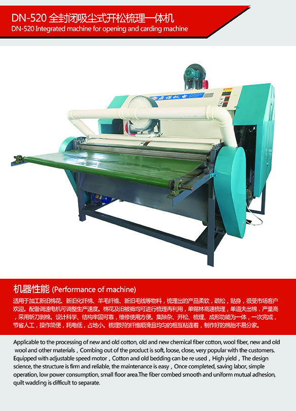 開松梳理一體機,集除雜、開松、疏松、成型功能為一體,一次完成,節(jié)省人工,操作簡便,耗電低,占地小。疏松好的纖維順滑且均勻的相互粘連著,制作好的棉胎不易分家。